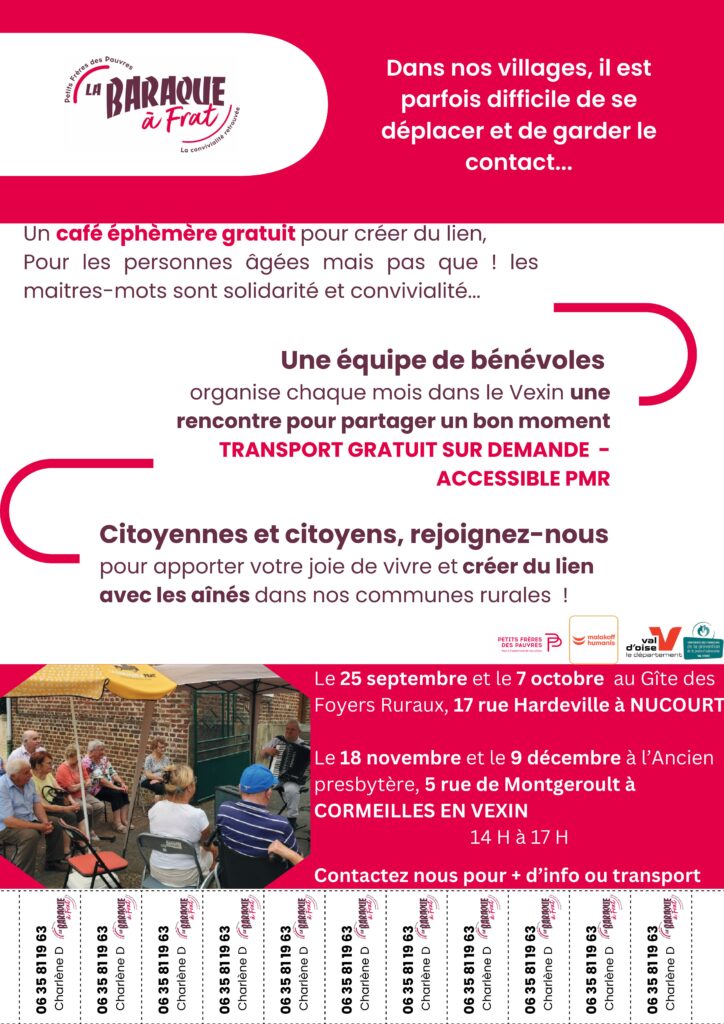Demain, mardi 18 Novembre et mardi 9 Décembre 2025, de 14H à 17H, les bénévoles des Petits Frères des Pauvres partent à la rencontre des personnes âgées isolées avec les Baraques à Frat’. À bord d’un véhicule aménagé, ils embarquent café, petits gâteaux, jeux et se poseront à Cormeilles-en-Vexin, à l’ancien presbytère au 5 rue de Montgeroult pour des moments d’échanges intergénérationnels.