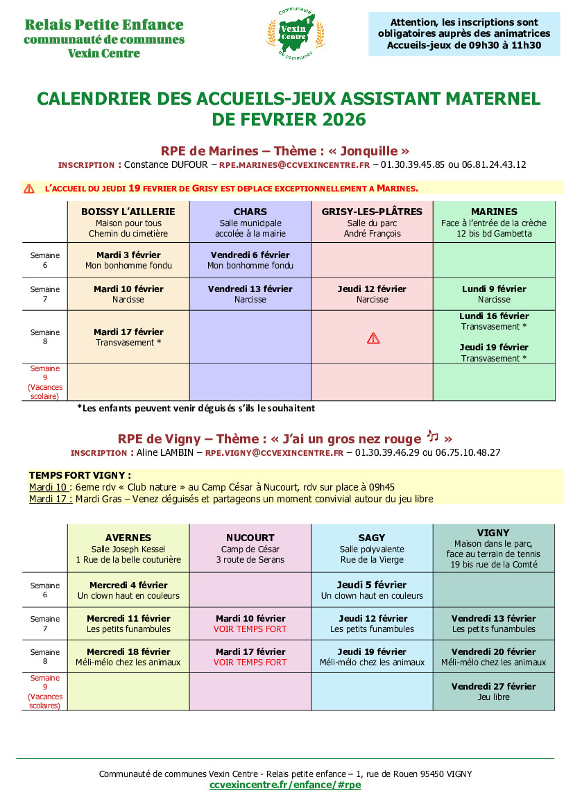 CALENDRIER DES ACCUEILS-JEUX ASSISTANT MATERNEL DE FÉVRIER