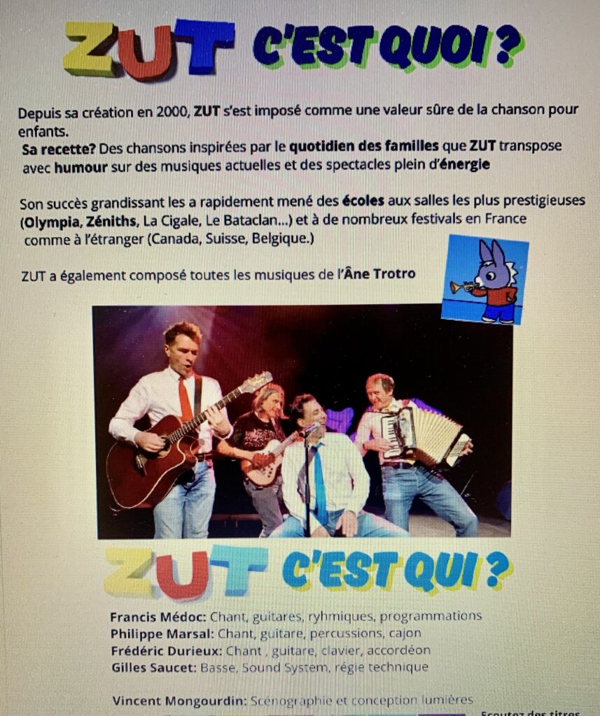 🎉Un évènement 🎉 à destination des enfants à ne pas manquer avec la venue du GROUPE « ZUT » qui s’est produit sur de nombreuses scènes parisiennes et étrangères.