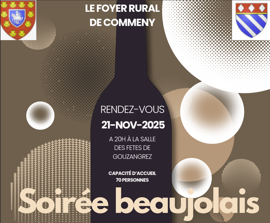 Le foyer rural de Commeny est heureux de vous convier à une soirée “Beaujolais” le vendredi 21 novembre à 20h, dans la salle des fêtes de Gouzangrez.