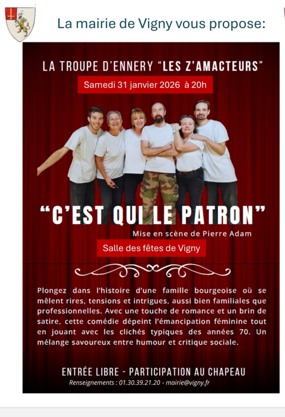 La troupe des “Z’AMACTEURS” et la mairie de Vigny vous propose une soirée théâtre: “c’est qui le patron” vous plonge dans une pièce drôle sur fond de critique sociale pour un savoureux moment!